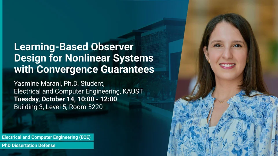Learning-Based Observer Design for Nonlinear Systems with Convergence Guarantees Yasmine Marani, Ph.D. Student, Electrical and Computer Engineering Oct 14, 10:00 - 12:00 B3 L5 R5220